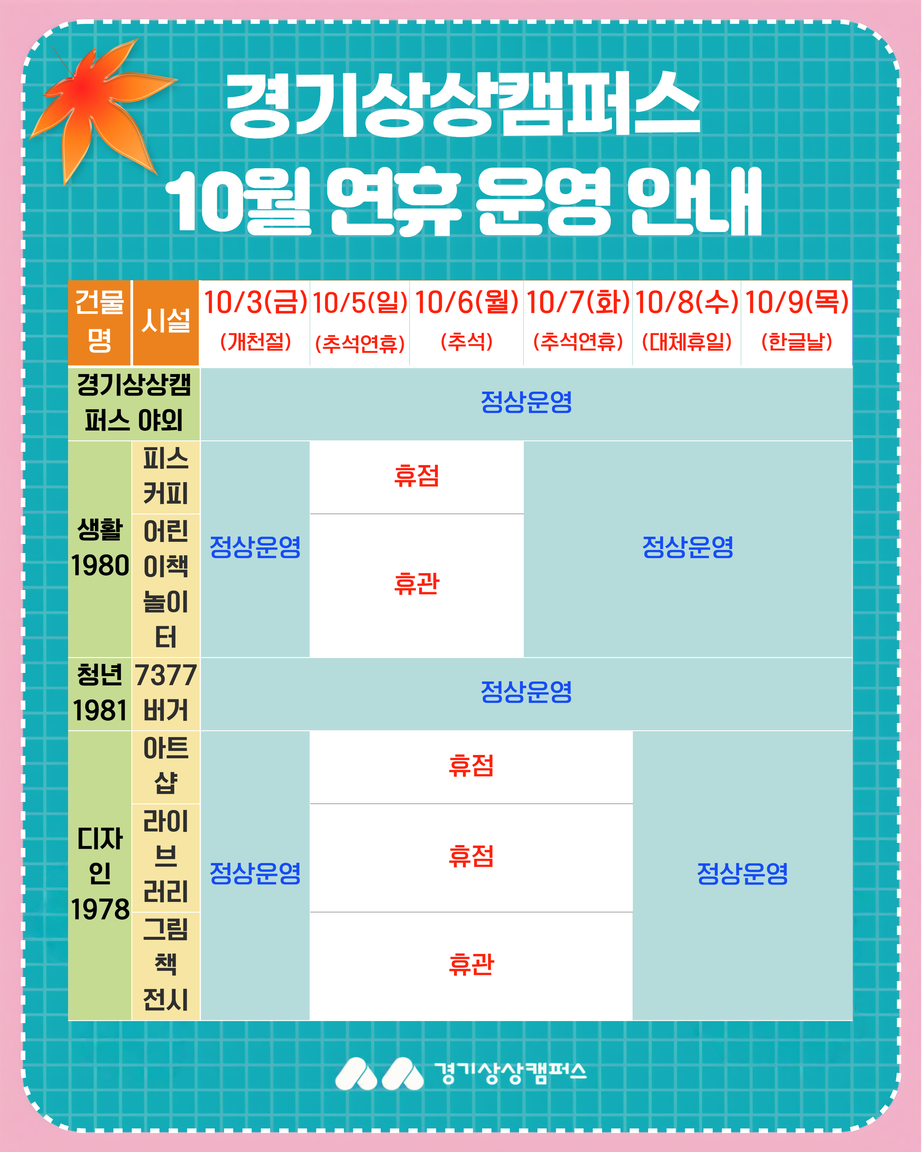 상캠지기가 경기상상캠퍼스의 10월 3일, 5일~9일 연휴 공간 운영을 안내드립니다 🤗