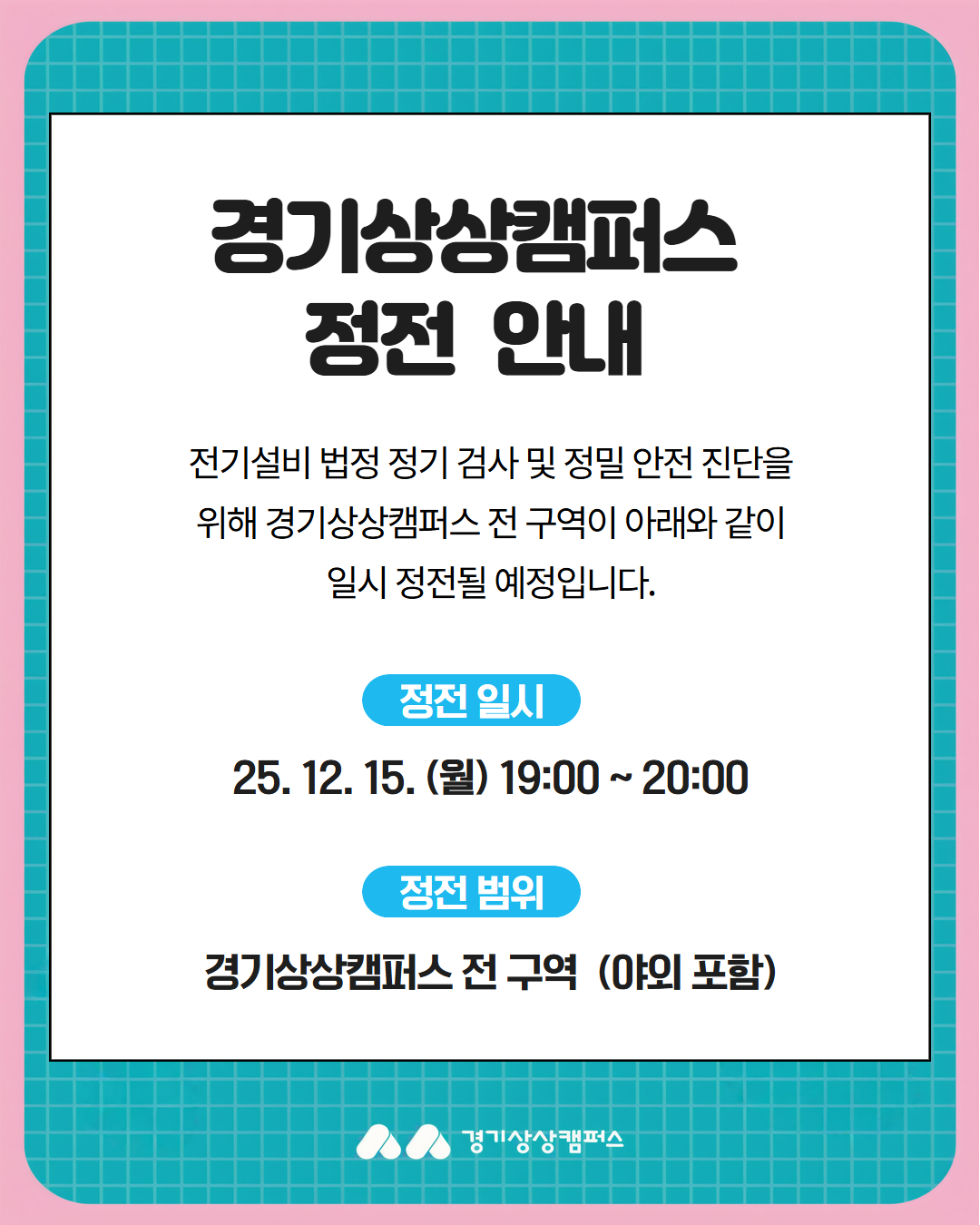 검사 시간 동안 경기상상캠퍼스 전 구역이 일시 정전되오니 적극적인 협조 부탁드립니다.