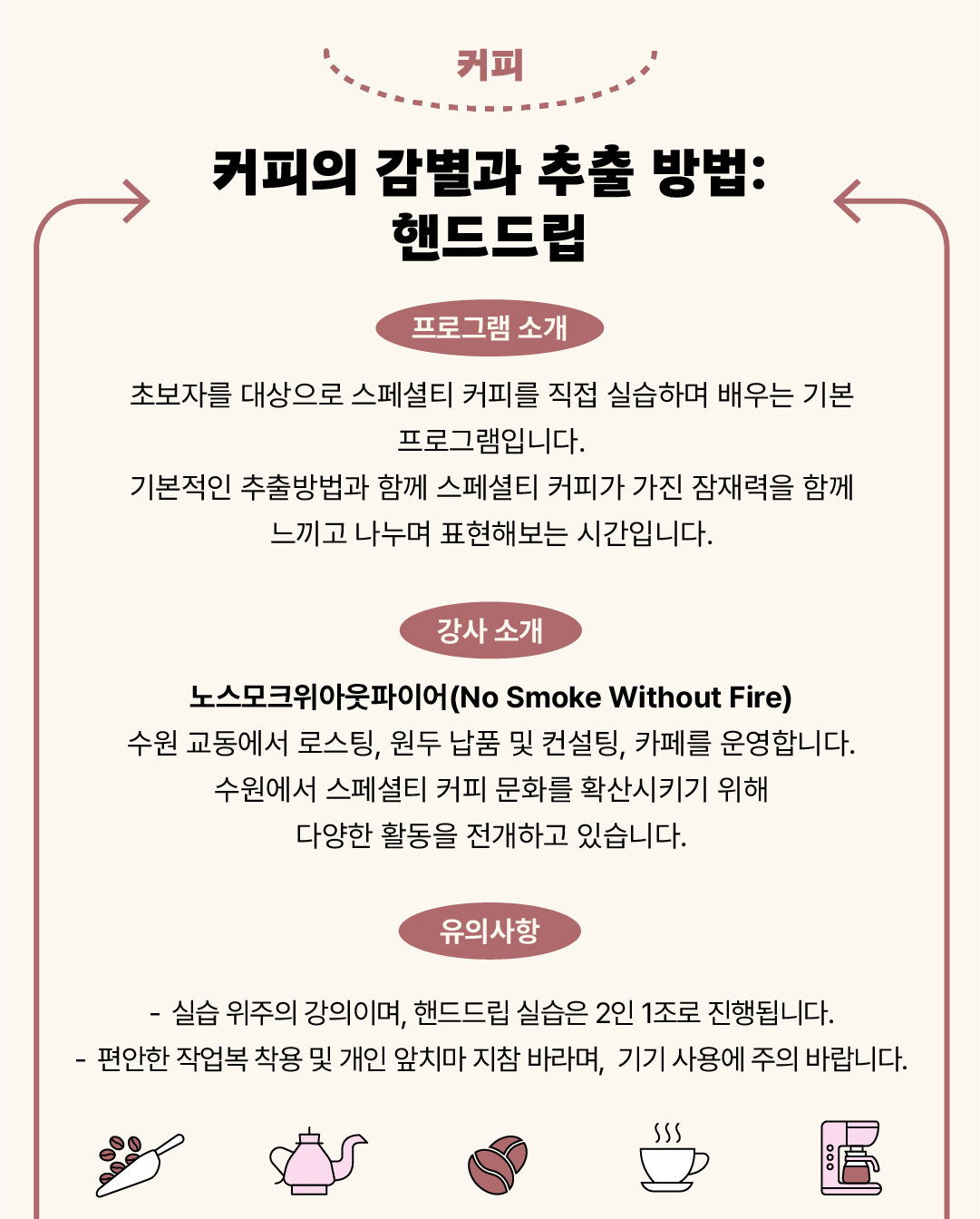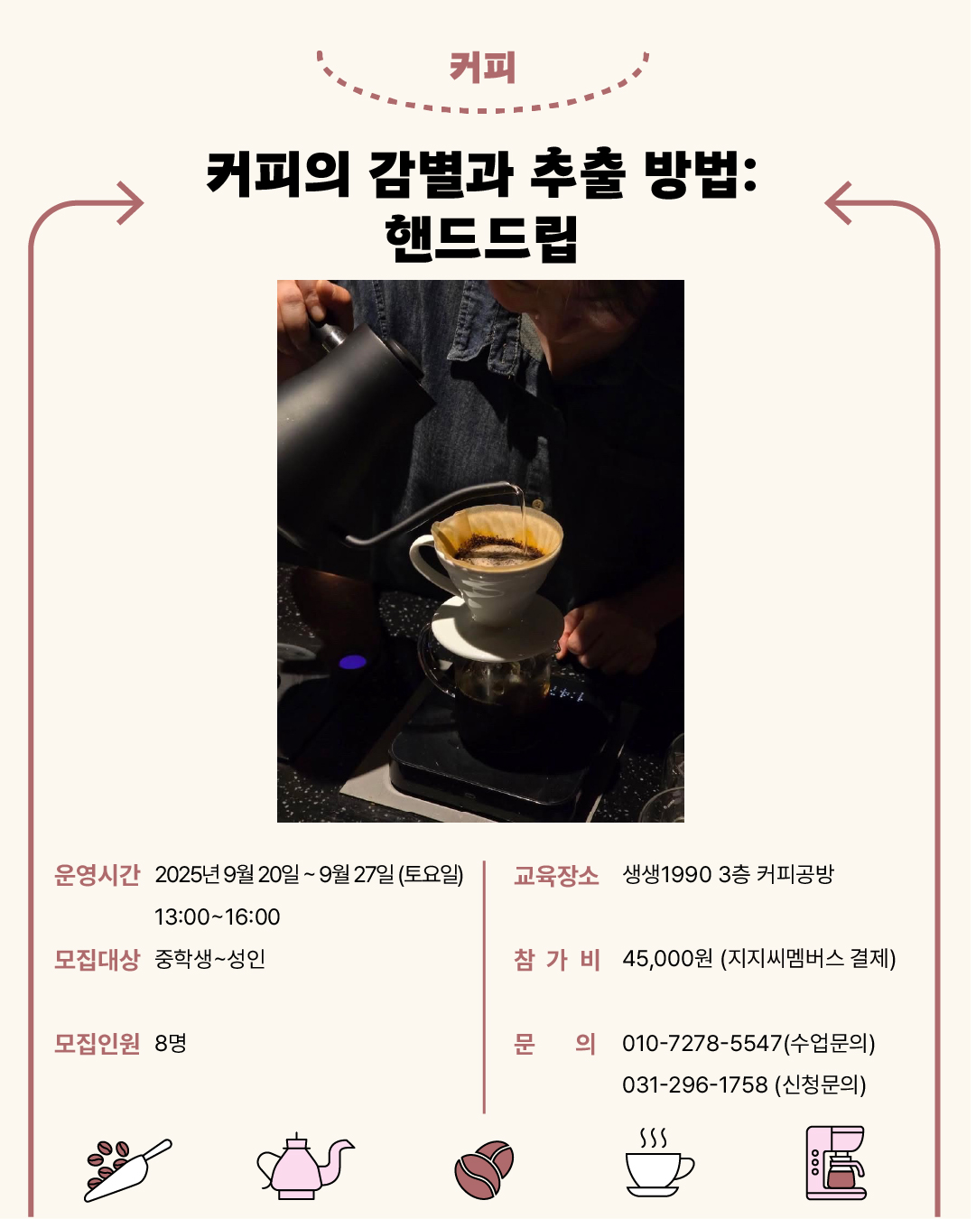 매주 토요일 13:00~16:00대 상 중학생~성인 장 소 경기상상캠퍼스 생생1990 생활창작공방 커피공방