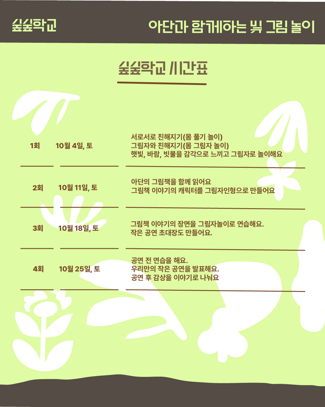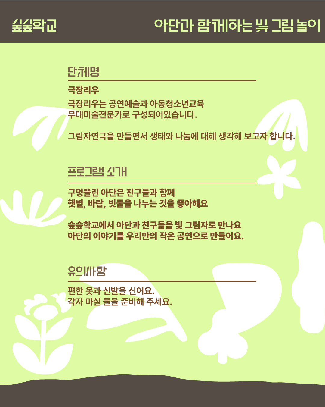 숲숲학교에서 아단과 친구들을 빛 그림자로 만나요