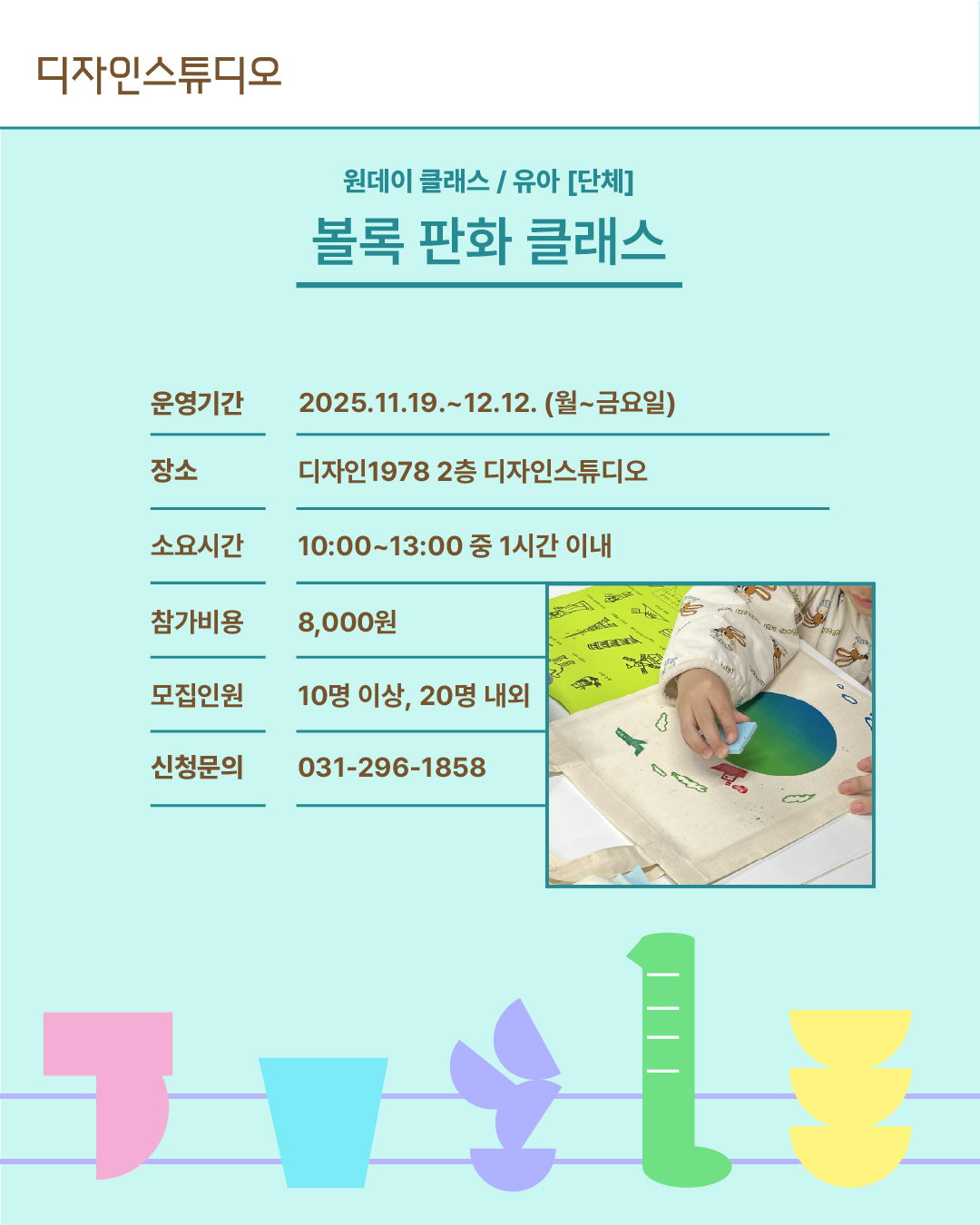10:00~13:00대 상 유아 단체 10명 이상, 20명 내외 장 소 경기상상캠퍼스 디자인1978 2층 디자인스튜디오