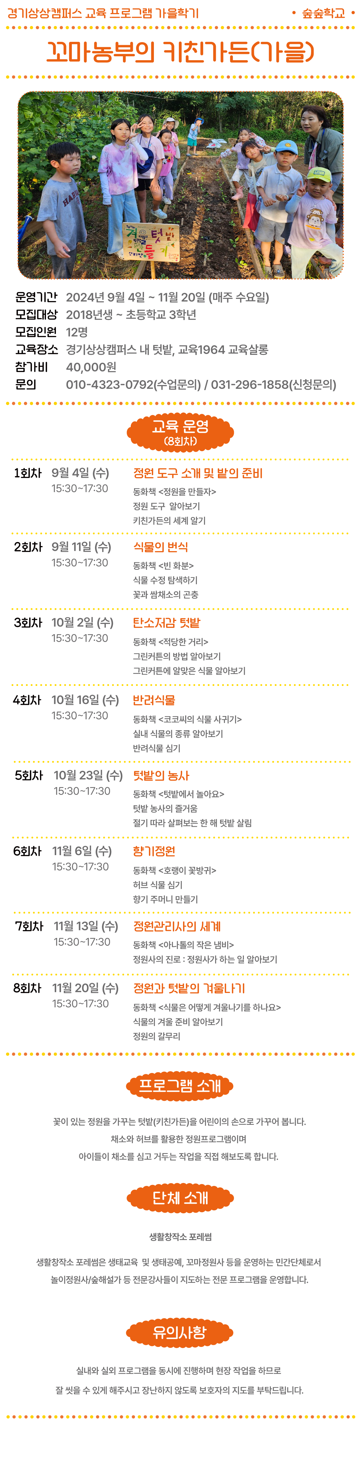(매주 수요일 15:30~17:30)대 상 2018년생~초등학교 3학년 정 원 12명 장 소 경기상상캠퍼스 교육1964 1층 교육살롱 및 텃밭